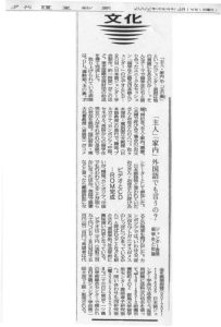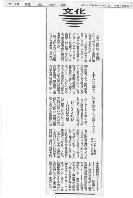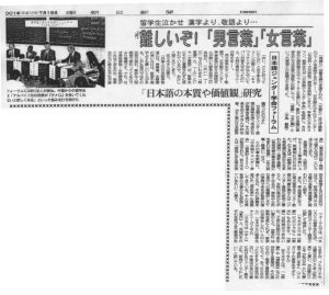学会紹介記事 日本語ジェンダー学会が新聞記事で多数紹介されました。以下の記事はその一部です。 第20回年次大会 基調講演「わたしの名前、あなたの名前」 パネルディスカッション「家族の呼称をめぐる文化とジェンダー 」 に関する毎日新聞記事:2019年7月18日朝刊 ジャパネット創始者、髙田明さんによる第19回年次大会 基調講演 「伝わることば、伝えることば」 毎日新聞記事:2018年6月24日(記事の掲載許可取得済み) 長崎新聞記事:2018年6月24日(記事の掲載許可取得済み) 読売新聞夕刊 2002年3月19日 (記事の掲載許可取得済み) 朝日新聞 2001年7月18日(記事の掲載許可取得済み) 読売新聞 2001年5月22日(記事の掲載許可取得済み) HOME Copyright © 2001 The Society for Gender Studies in Japanese All rights reserved